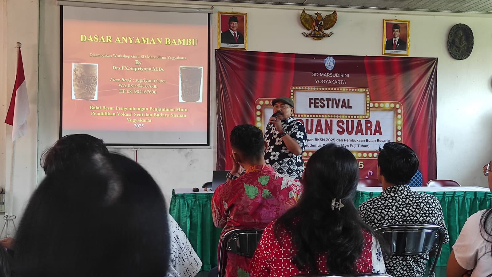 Pada hari Sabtu, 11 Oktober 2025, SD Marsudirini Yogyakarta menyelenggarakan Workshop Kriya Anyam “Bambu dan Rotan Menuju FLS3N 2026”. Kegiatan ini bertujuan untuk membekali para guru dengan ketrampilan menganyam yang nantinya akan membantu guru dalam mendampingi siswa mempersiapkan diri untuk berkompetisi di ajang FLS3N cabang seni kriya anyam.